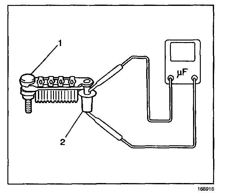 10. Measure the condenser (2) capacity using a digital capacitor meter. If the condenser capacity is not 0.5 microfarads, replace the rectifier (1).