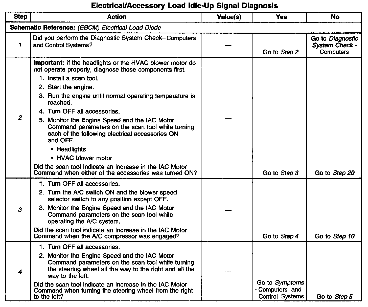 2. This step checks whether the PCM is responding to the electrical load idle-up inputs by commanding the IAC valve to increase the IAC Motor Command percentage. The IAC Motor Command parameter on the scan tool should increase 2 to 3 percent when operating the accessory. If the scan tool does not indicate an increase in the IAC Motor Command when the accessory is turned ON, the PCM may not be receiving the idle-up signal.