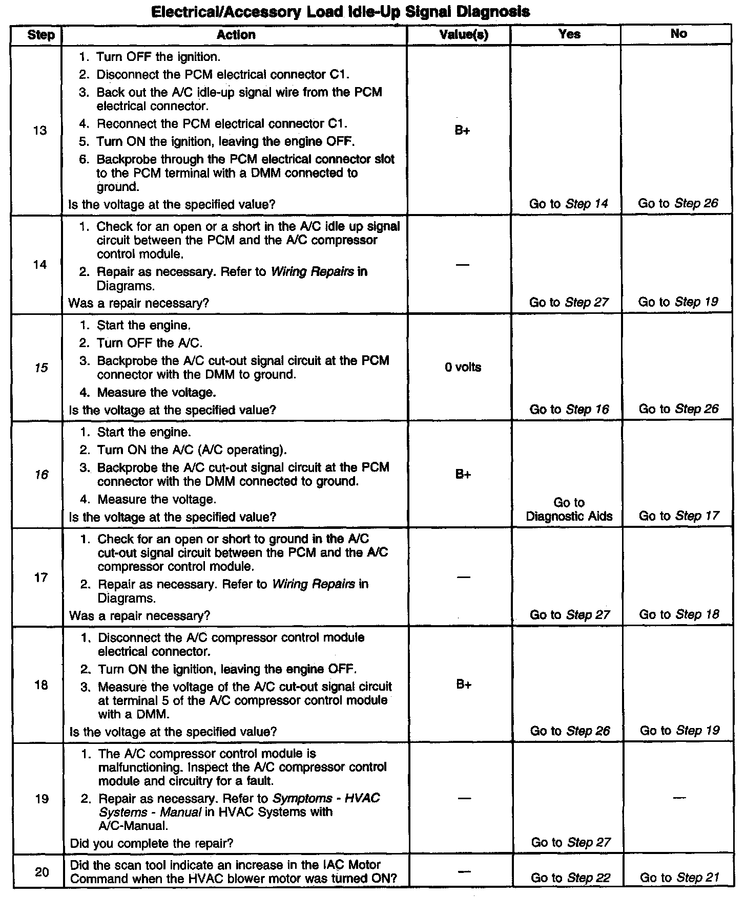 12. The A/C idle-up signal circuit at the PCM should indicate B+ with the A/C OFF (not operating).