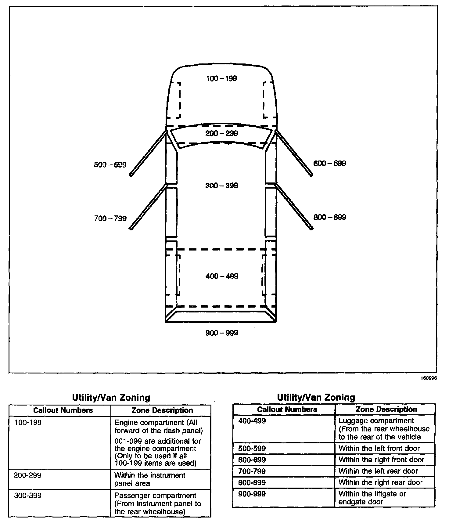 All grounds, in-line connectors, pass-through grommets, and splices have identifying numbers that correspond to where they are located in the vehicle. The table explains the numbering system.