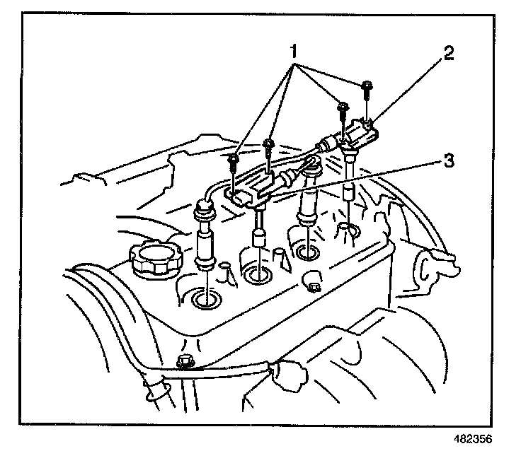 3. Remove the two bolts (1) and the 2-3 ignition coil (3) from the engine.