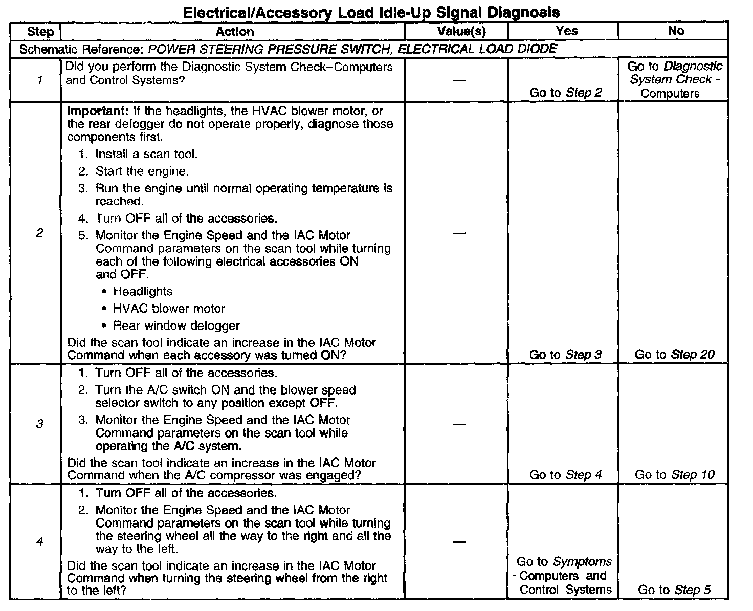 4. This step checks whether the PCM is responding to the electrical load idle-up input of the PSP switch. The PCM commands the IAC valve to increase the IAC Motor Command percentage when receiving the PSP idle-up signal. The IAC Motor Command parameter on the scan tool should increase 2 to 3 percent when increasing the power steering system pressure. If the scan tool does not indicate an increase in the IAC Motor Command when the accessory is turned ON, the PCM may not be receiving the idle-up signal.