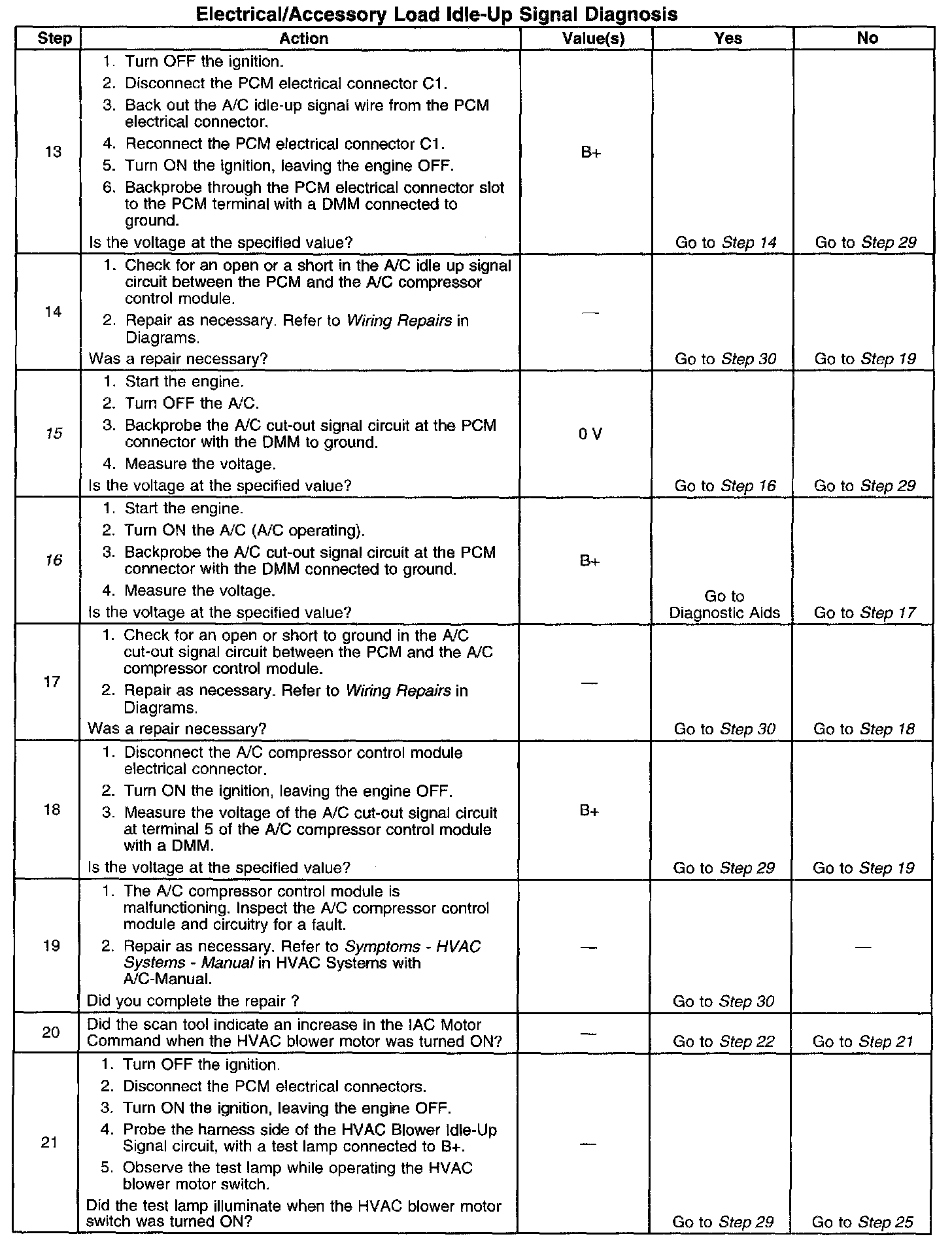 12. The A/C idle-up signal circuit at the PCM should indicate B+ with the A/C OFF (not operating).