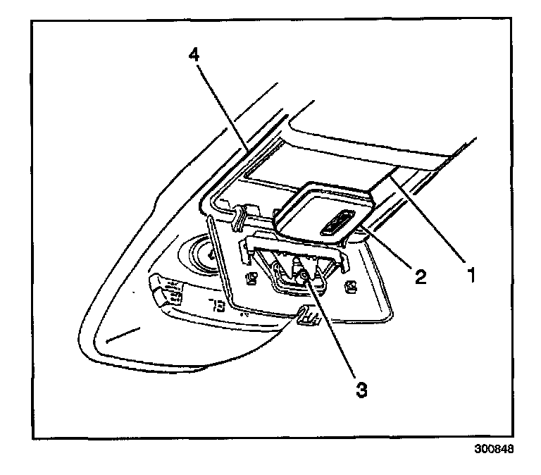 The overhead console (4) provides a location for installing a garage door opener transmitter (2). Use the following procedure in order to install a transmitter:1. Using a flat-bladed tool press the compartment latch forward in order to open the compartment door.