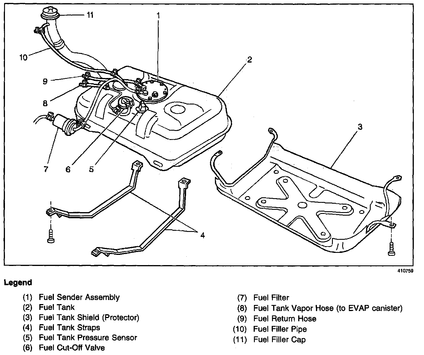 The fuel tank has a storage capacity of 66 liters (17.4 gallons). The fuel tank is manufactured from steel and is located behind the rear wheels below the rear seat area. The shape of this tank was designed to allow for a constant supply of fuel around the fuel pump strainer during low fuel conditions and also during aggressive vehicle maneuvers. The fuel tank is equipped with a fuel cut-off valve. The fuel cut-off valve consists of a float and a spring. The fuel cut-off valve allows only fuel vapors to enter the fuel vapor pipe: