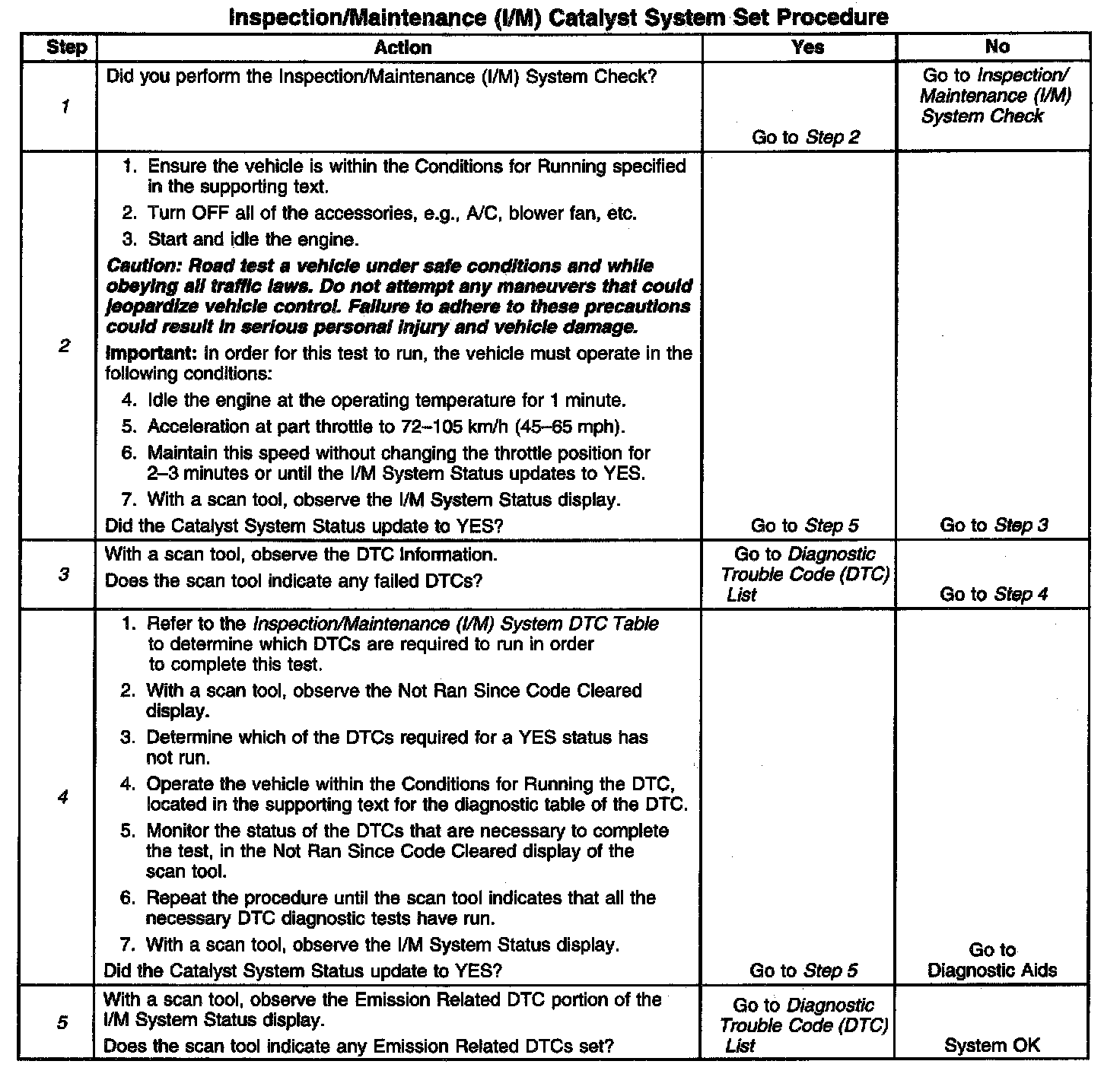 5. The I/M System Status only reports on whether or not a diagnostic has run, not what the outcome of the test was. If any Emission Related DTC sets after the tests are complete, the DTC will require diagnosis.