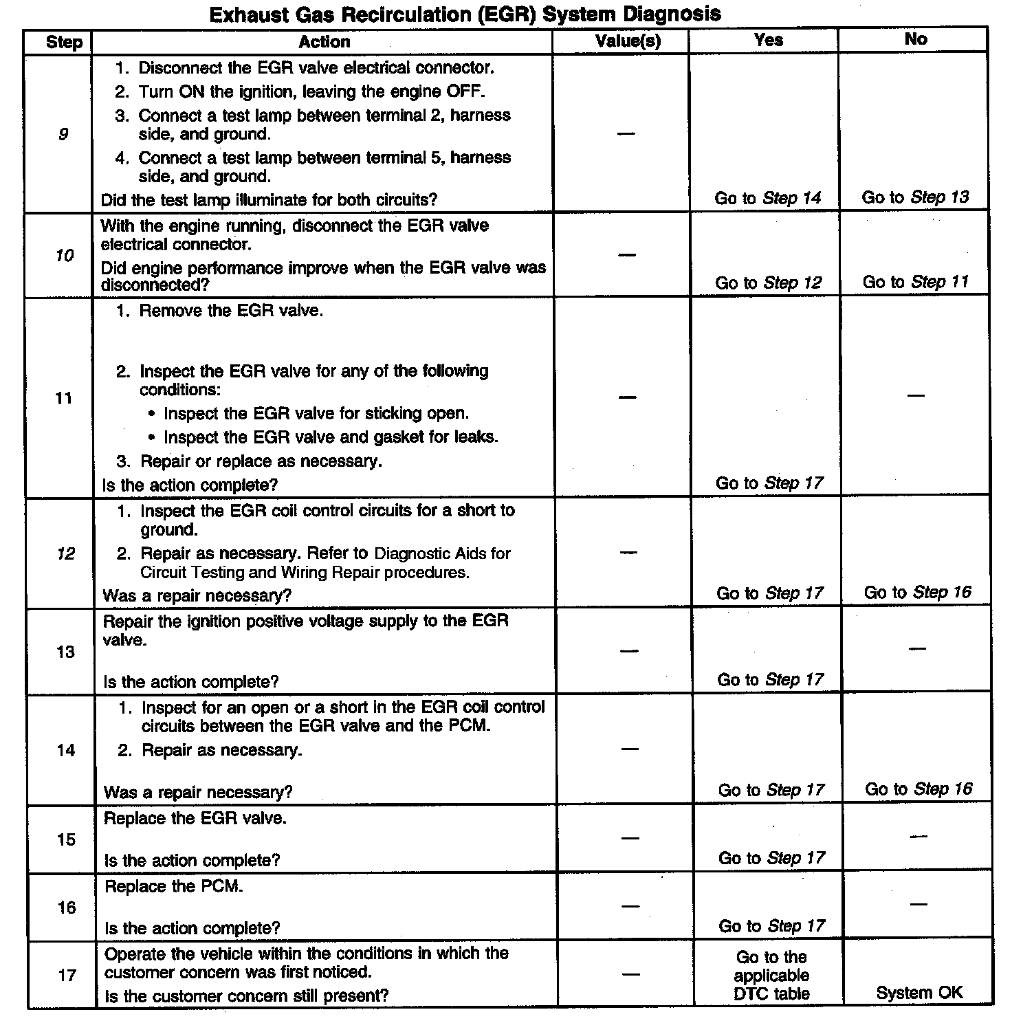 10. This step determines whether an electrical fault is the cause of the EGR valve staying open. A grounded EGR valve control circuit can cause the EGR valve to be open all the time.