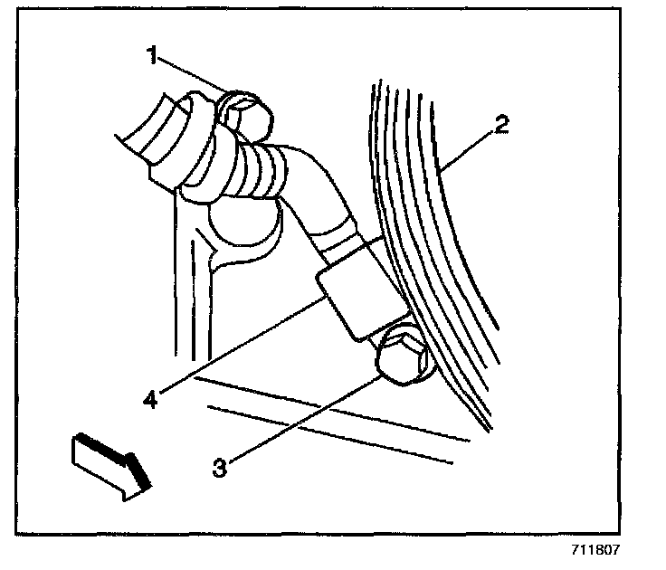 4. Secure the sensor wire harness to the engine block with the clip and the bolt (1).