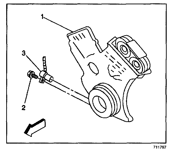 2. Remove the bolt (1) and the sensor wire harness clip from the engine.