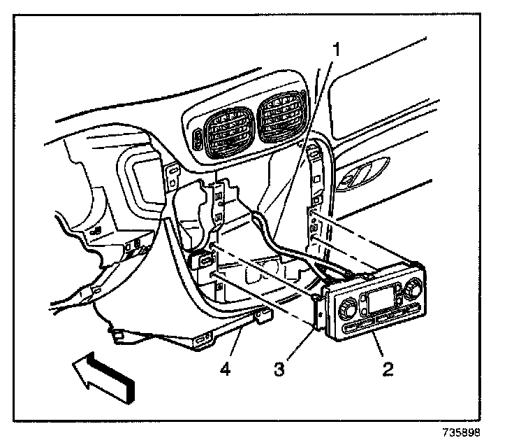 3. Depress the HVAC control module retaining tabs (3) and remove the HVAC control module (2) from the instrument panel (4).