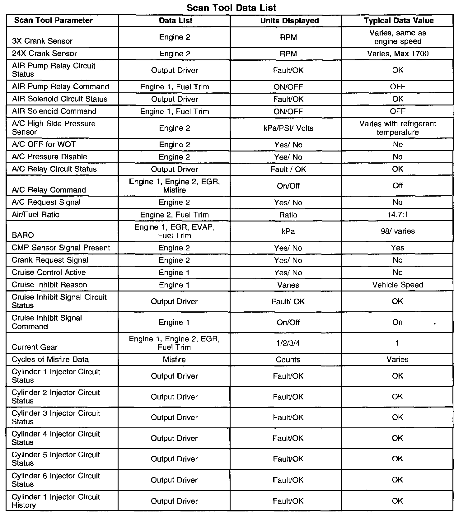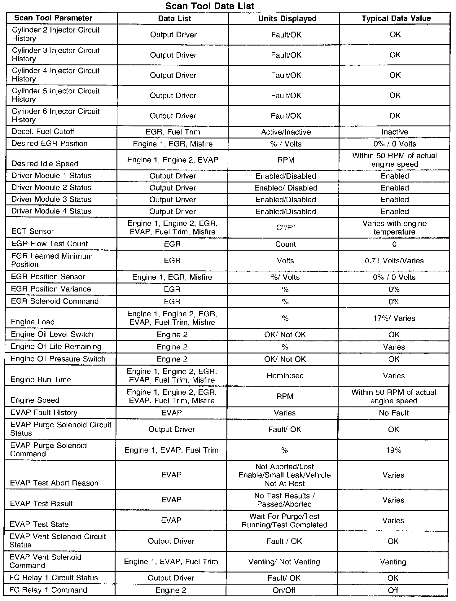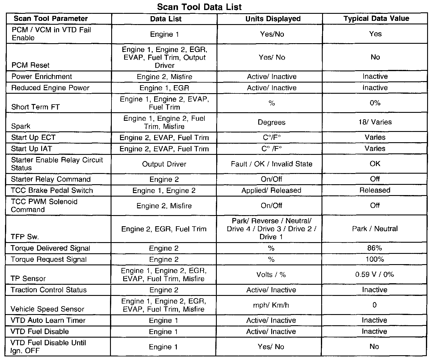 The Typical Scan Data Values table contains all the parameters included in the following data lists arranged in alphabetical order: