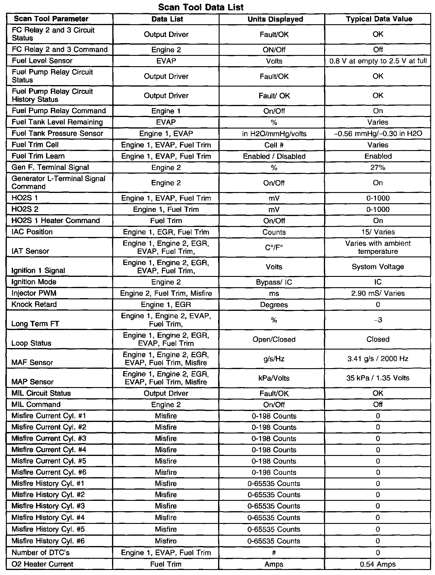 - Engine Data 1-Contains regarding fuel delivery, idle air control (IAC) position, heated oxygen sensor (HO2S 1), HO2S 2, and other basic engine operating conditions.