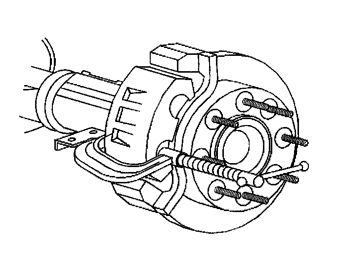 Notice: Support the brake caliper with heavy mechanic's wire, or equivalent whenever it is separated from it's mount and the hydraulic flexible brake hose is still connected. Failure to support the caliper in this manner will cause the flexible brake hose to bear the weight of the caliper, which may cause damage to the brake hose and in fur may cause a brake fluid leak.