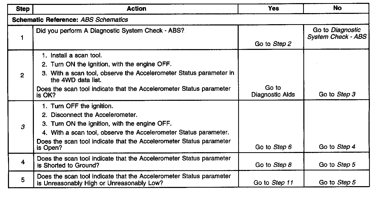 The voltage signal ranges, from 2.4 to 2.6 volts at zero speed change (constant motion) or stationary. The accelerometer voltage signal drops when the vehicle is under acceleration. The accelerometer voltage signal increases when the vehicle is under deceleration.