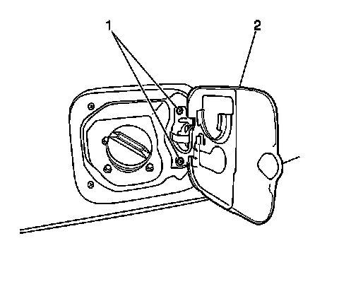 2. Remove the fuel tank filler door (2) from the vehicle.