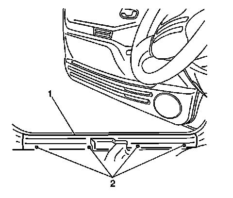 Install the front side door sill trim plate (1) to the vehicle. Secure the trim plate with the 4 plastic retainers (2).