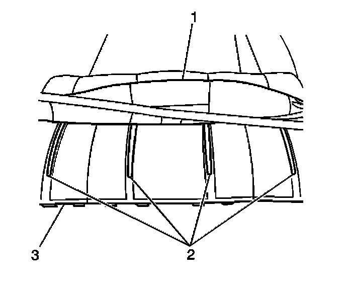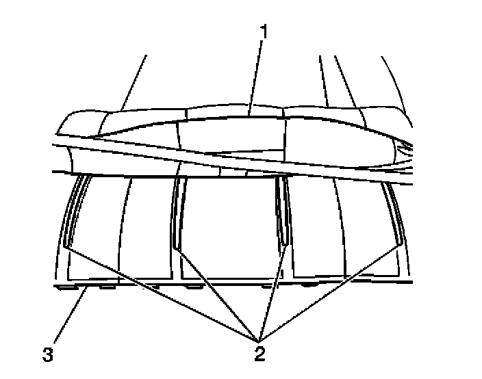 1. Install the rear seat back cushion cover (1) to the rear seat back cushion pad and frame (3). Ensure that the cover is fully secured to the pad at the velcro strips (2).
