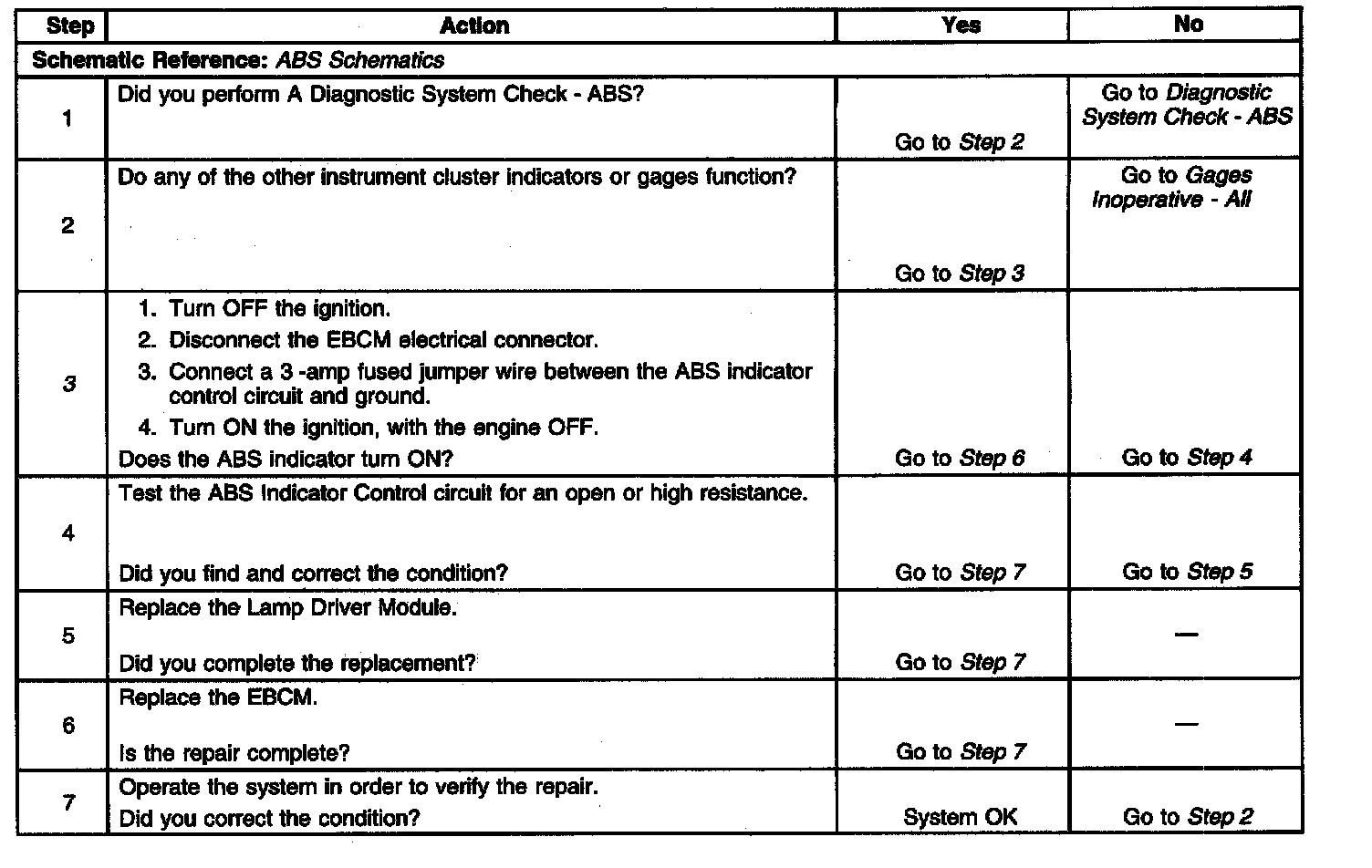 The Electronic Brake Control Module (EBCM) controls the operation of the amber ABS indicator lamp by means of a lamp driver module. When the ignition switch is turned to the ON position, the EBCM turns ON the ABS indicator for 3 seconds for a bulb check. Whenever a malfunction is detected within the ABS system, the EBCM turns ON the ABS indicator, notifying the driver that ABS needs to be serviced.