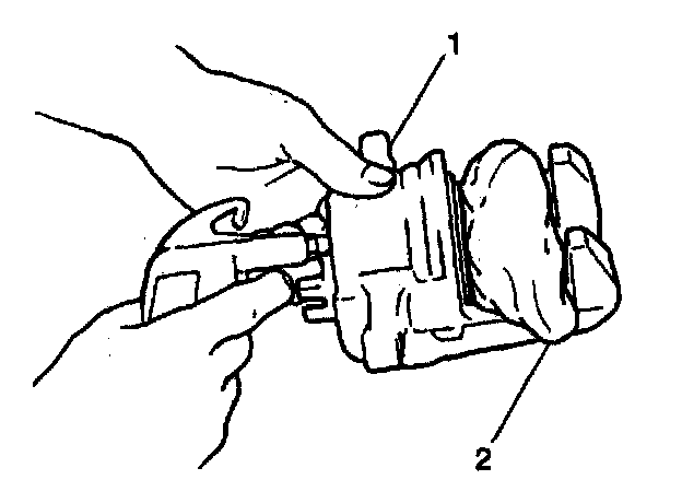 4. Insert a block of hard wood or a shop cloth (2) into the caliper interior (1) to catch the piston as it is forced out of the bore with compressed air.