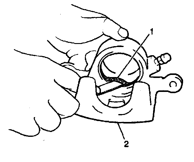 7. Use a flat plastic tool in order to remove the piston seal (1) from the caliper (2).