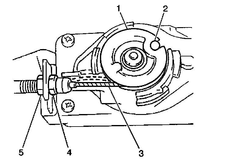5. Adjust the cruise control servo cable locknut (5) in order to adjust the cruise control cable play.