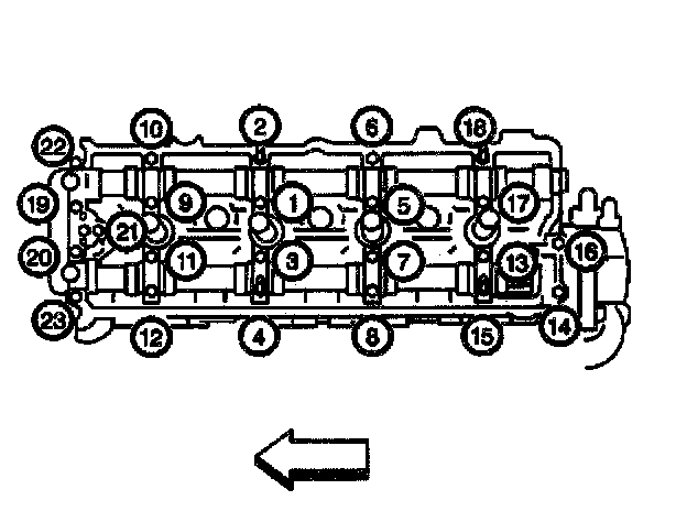 - Tighten the camshaft bearing caps in 3 progressive steps in the sequence shown to 11 Nm (97 inch lbs.).