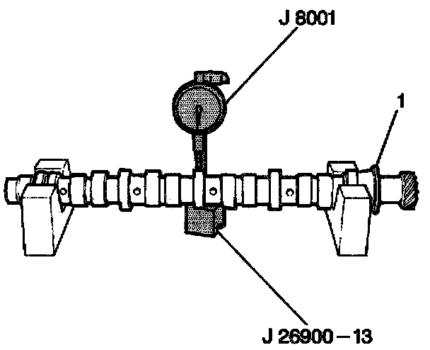2. Place the camshaft (1) onto V-blocks. Measure the camshaft runout using the J 8001 with the J26900-13. Replace the camshaft if the runout exceeds 0.10 mm (0.0039 inch).