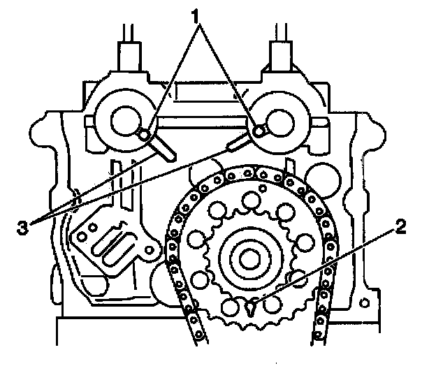 5. Install the camshaft aligning the guide pins (1) with the notches (3) on the cylinder head.