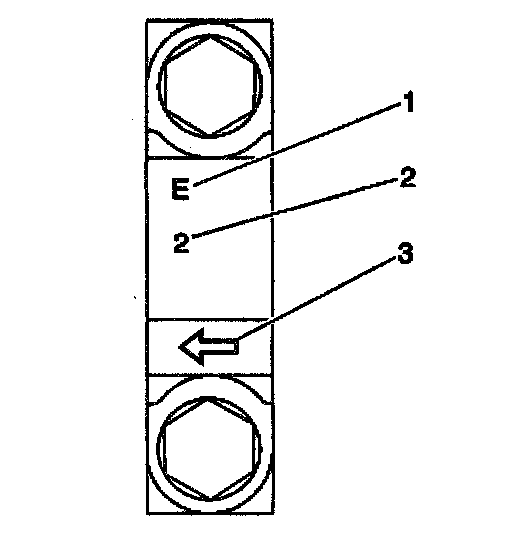 8. Install the camshaft bearing caps. The caps are marked intake or exhaust (1), position away from the timing chain (2), and direction toward the timing chain (3).