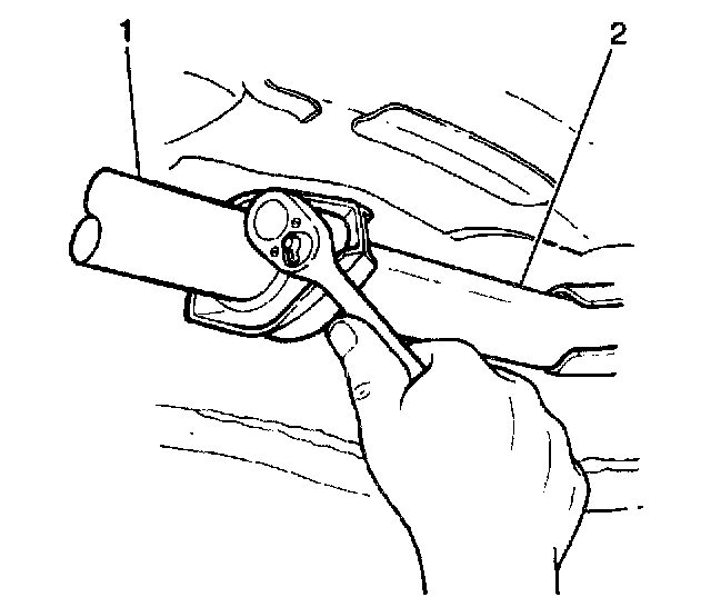 2. Remove the TWC nuts from the catalytic converter assembly (1) and separate from the resonator/muffler/tail pipe assembly (2).