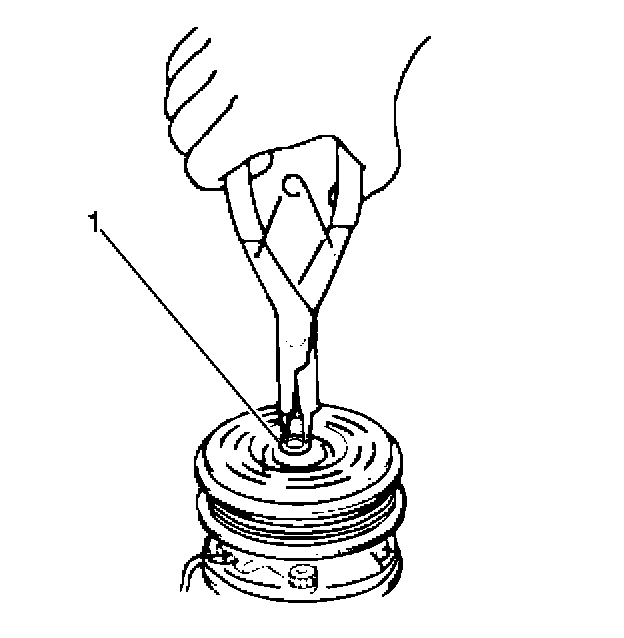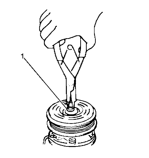 3. Remove the clutch pulley snap ring (1) and the shim, using the appropriate snap ring pliers.
