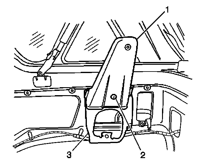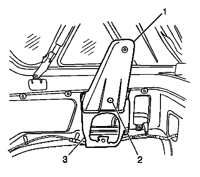 2. Install the rear seat shoulder belt guide bracket cover (1) to the rear seat shoulder guide bracket (3). Secure the bracket cover with the plastic retainer (2).