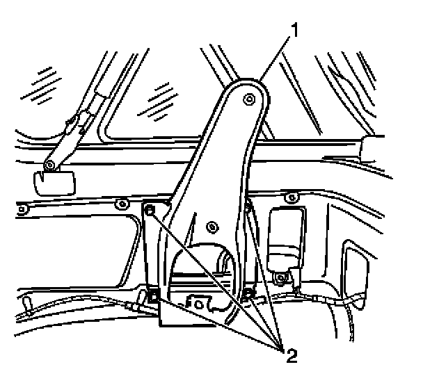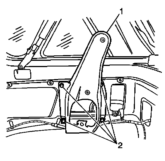 1. Install the rear seat shoulder belt guide bracket (1) to the vehicle. Secure the bracket with the 4 bolts (2).