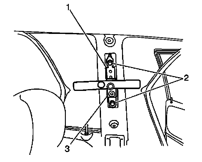 1. Install the front seat belt shoulder belt retractor tension adjuster (1) to the vehicle. Secure the adjuster with the 2 bolts (2).
