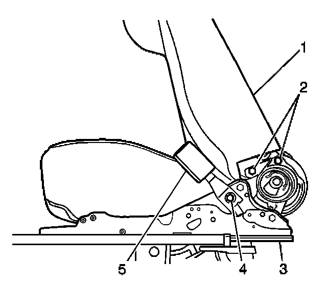1. Install the front seat belt buckle (5) to the front seat inner adjuster (3). Secure the buckle with the anchor bolt (4).