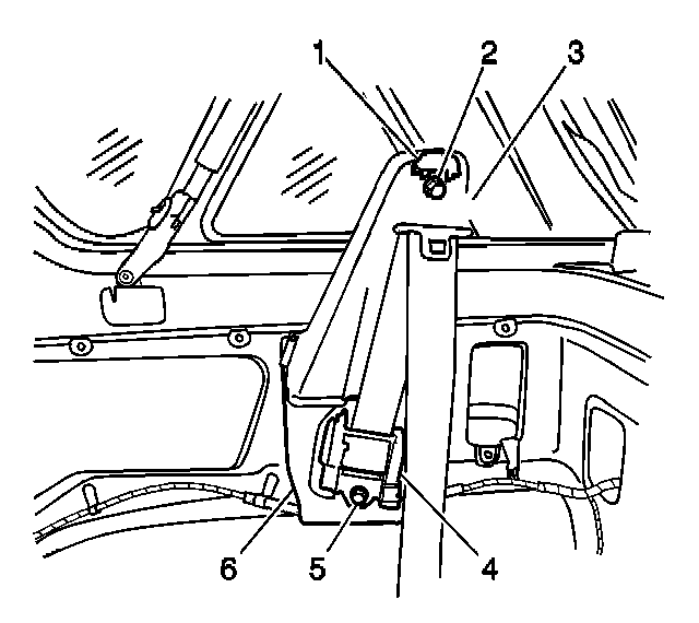 3. Remove the shoulder guide anchor bolt (2) which secures the rear seat belt to the rear seat belt mounting bracket (6).