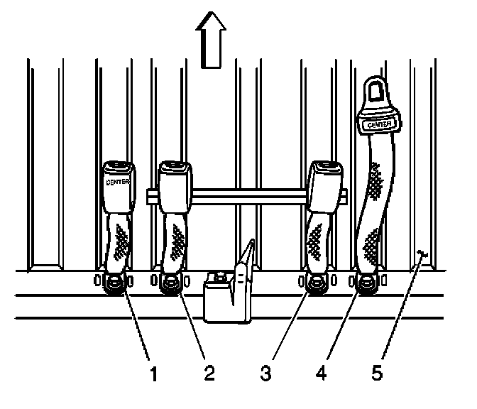 1. Install the rear seat center buckle (1) to the floor pan (5). Secure the buckle with the anchor bolt.