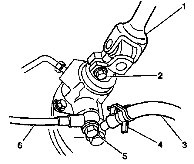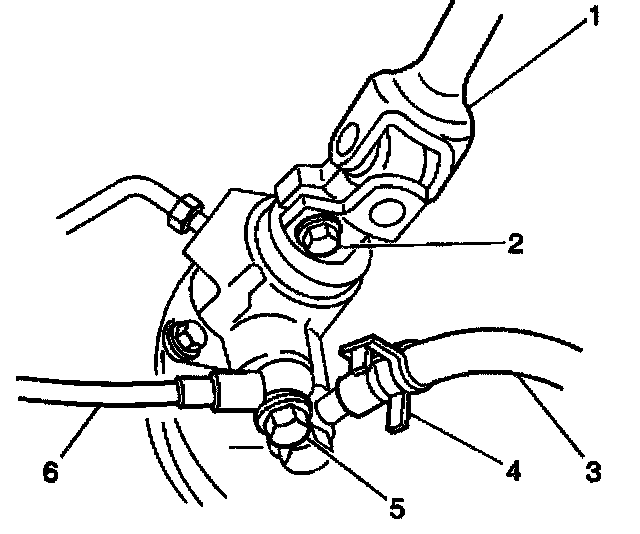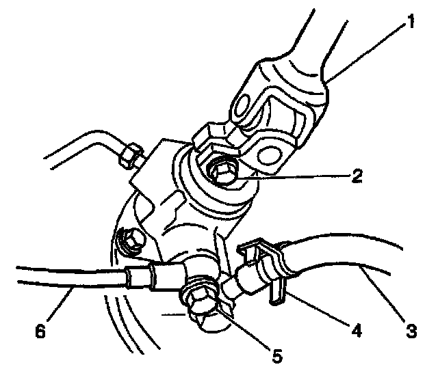 13. Remove the power steering gear inlet hose (6) and the 2 gaskets, if equipped, from the steering gear.