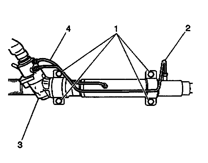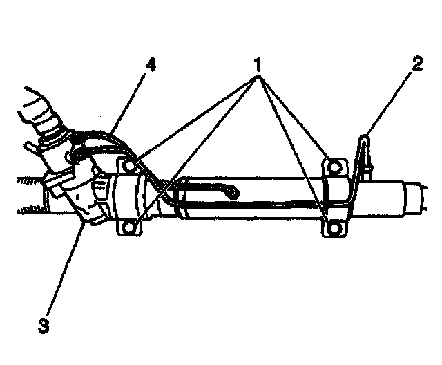Important: If you are replacing the steering gear, measure the location of the match mark made on the pinion shaft (3) and the steering gear housing (4). Make corresponding marks on the replacement steering gear in order to set the rack in the straight ahead position.