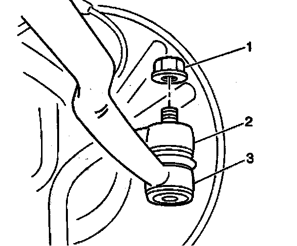 3. Remove the outer tie rod nut (1) from the knuckle (2).