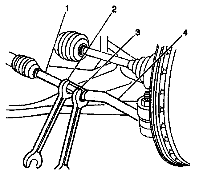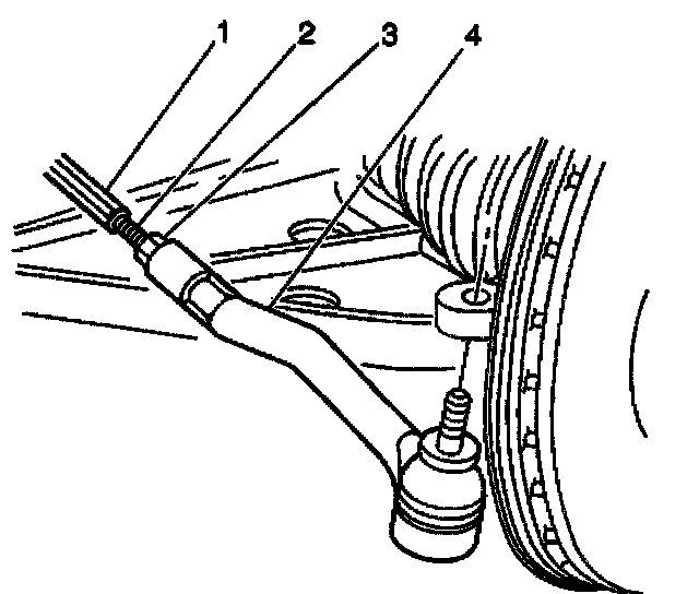 6. Loosen the tie rod lock nut and remove the outer tie rod end (4) from the inner tie rod (1).