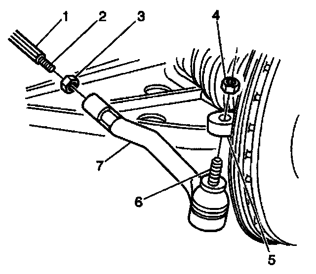 3. Install the outer tie rod end (7) to the knuckle (5), and install the outer tie rod nut (4).