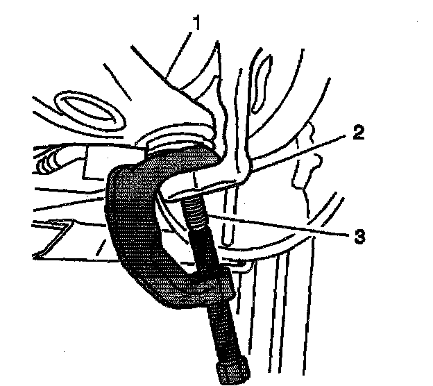 5. Use the J 43631 in order to separate the lower control arm ball stud (3) from the knuckle (2).