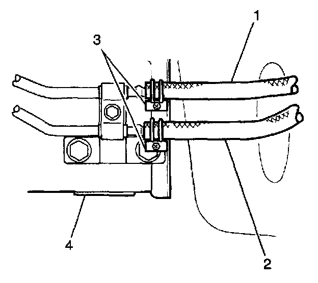 4. Secure the transmission cooler hoses with the 2 inlet and outlet hose clamps (2).