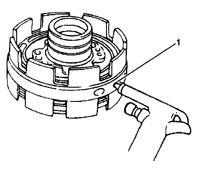 ^ Apply 392-785 kPa (57-114 psi) of air pressure into the second left overdrive case fluid passage (1).