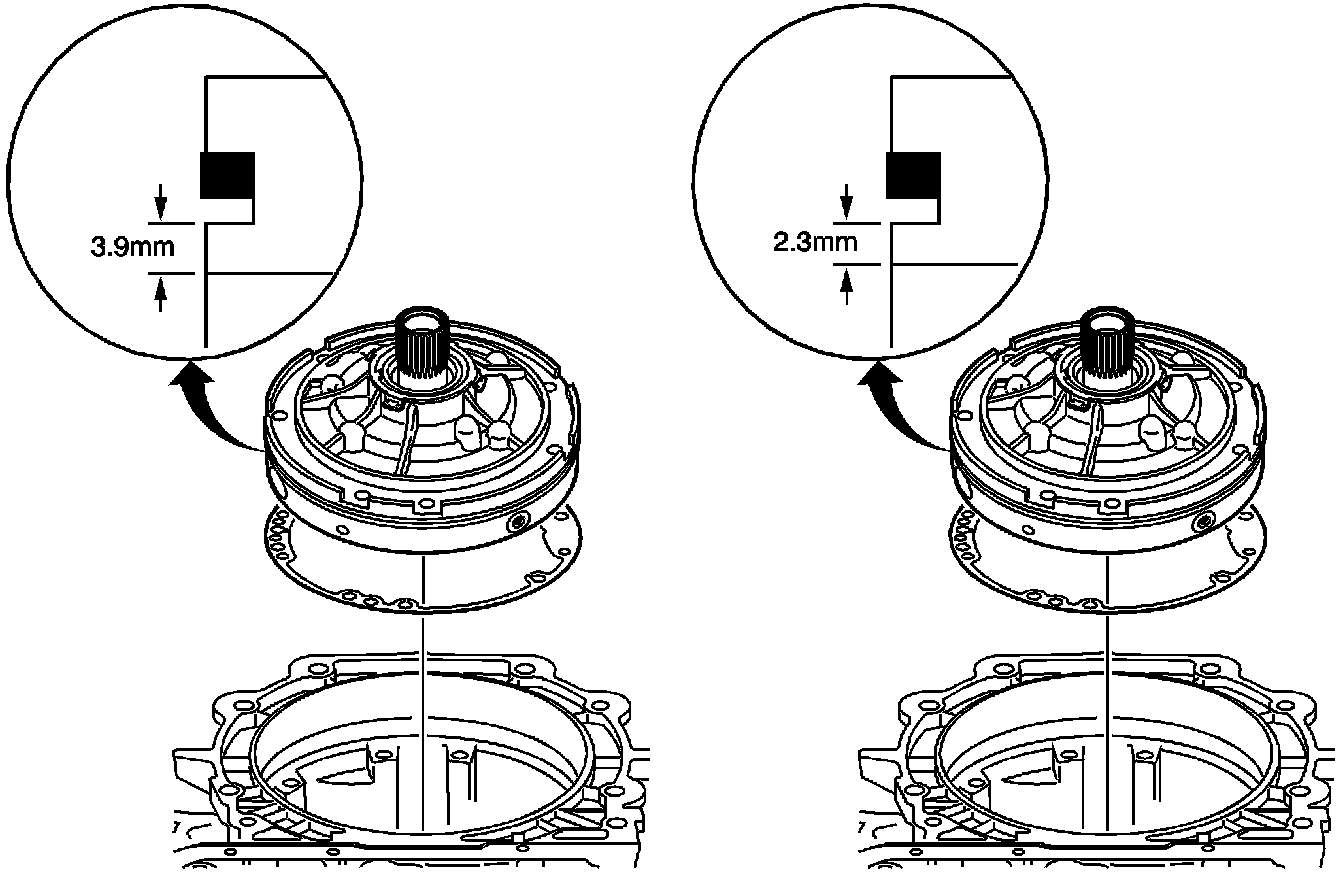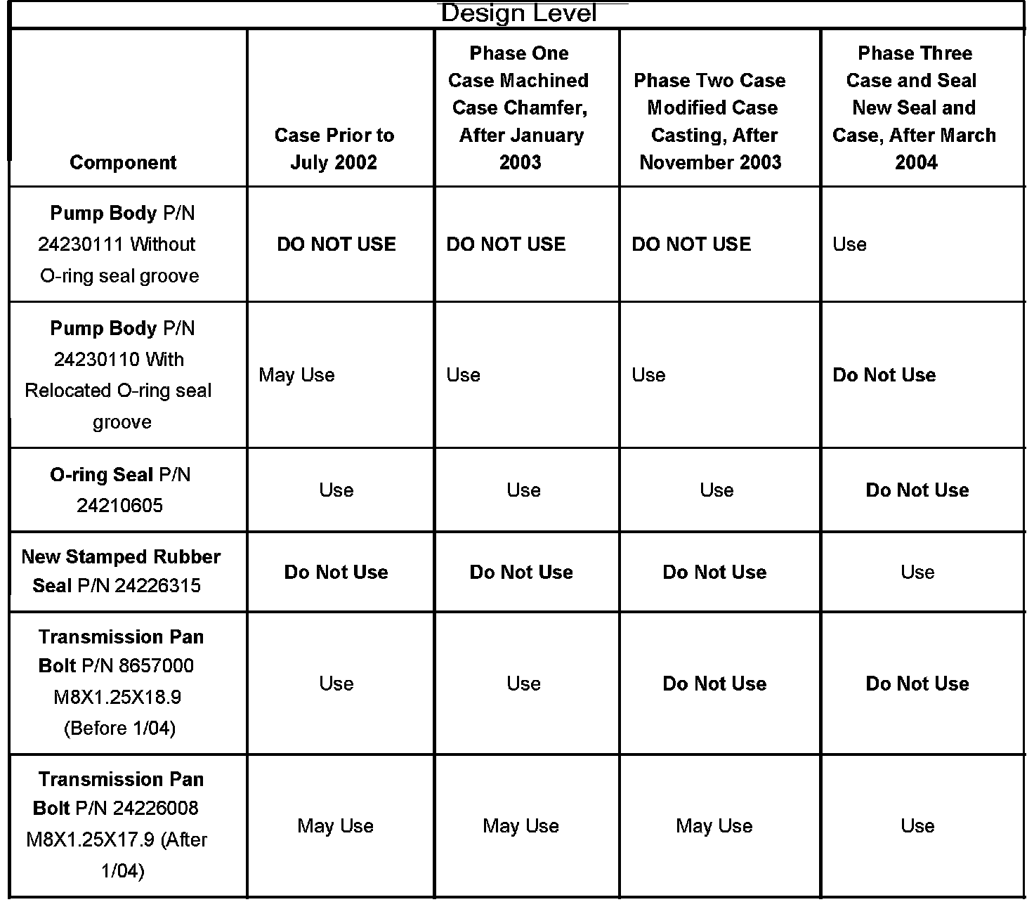 The first phase, beginning in September 2002, relocated the machining of the oil pump 0-ring seal groove in the pump body. The 0-ring seal groove moved 1.6 mm (0.62 in) inward on the pump body in order to place the sealing surface deeper into the case bore. The relocated pump body groove can be identified by measuring the groove location. Pump bodies that measure 2.3 mm (0.09 in) from the machined surface to the groove opening have the relocated 0-ring seal groove. Pump bodies that measure 3.9 mm (0.15 in) are prior to September 2002 design.