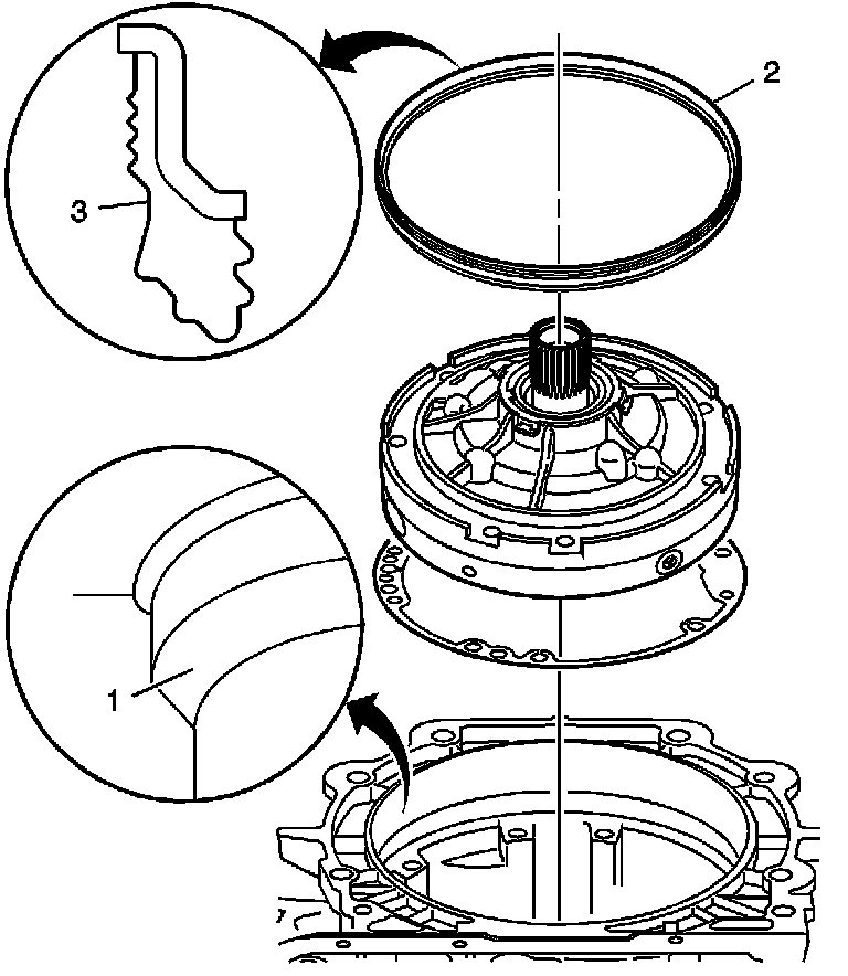 The pump sealing surface is now the outer diameter of the pump and the inner diameter (1) of the transmission case bore. Unlike the current 0-ring seal, which is installed on the oil pump body, the new seal is installed after the pump assembly is properly positioned and torqued in place. Seating the seal is accomplished when the torque converter housing is installed, which presses the seal (3) into position between the pump and the case bore (1).