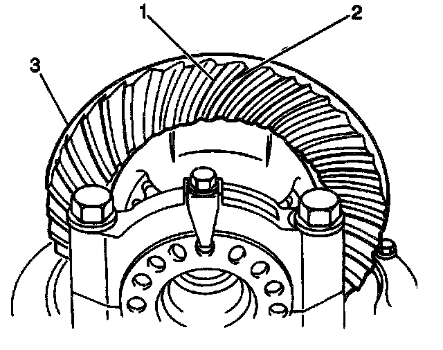 2. Inspect the contact pattern around the ring gear (3). Uneven contact around the ring gear indicates excessive ring gear runout.