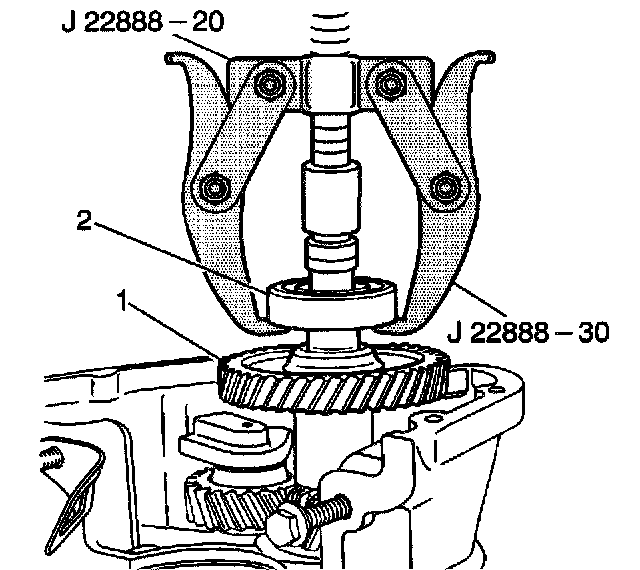 2. Use the J 22888-20 with the J 22888-30 in order to remove the rear countershaft bearing (2) from the countershaft.