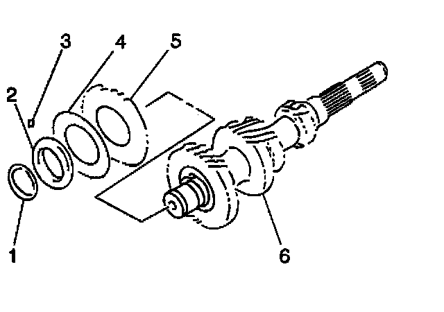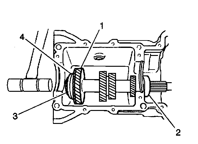 5. Install the front countershaft bearing C-ring (3) onto the front countershaft bearing (2). Position the countershaft so that the front countershaft bearing C-ring (3) makes slight contact with the lower case.